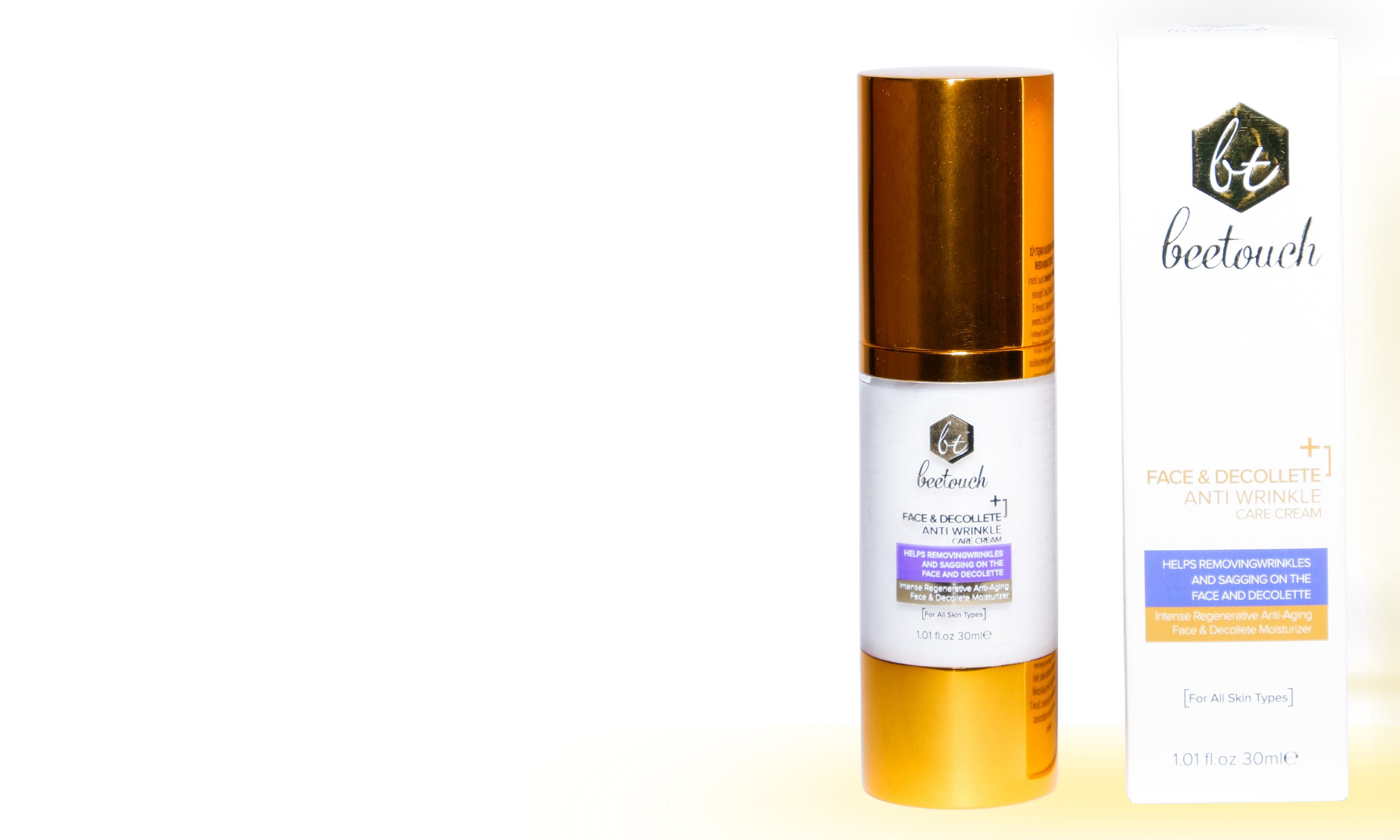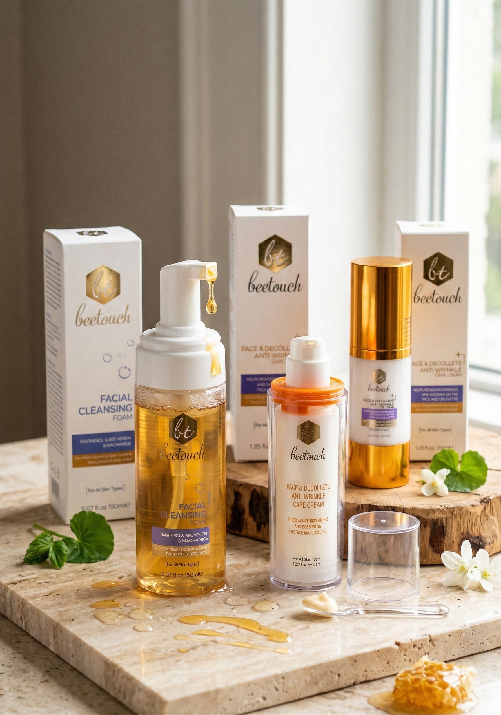 Bee Touch ürünleri arı zehri ve özel aktif bileşenlerle cildin elastikiyetini artırmaya ve kırışıklık görünümünü azaltmaya yardımcı olur.